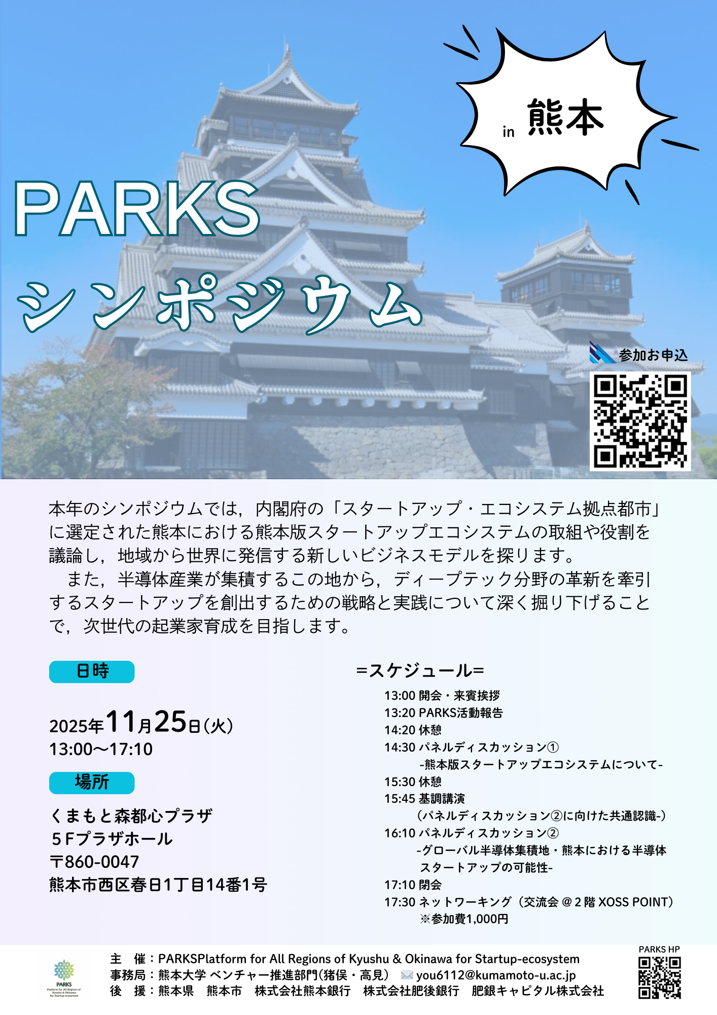 2025年11月25日(火)、くまもと森都心プラザ 5F プラザホール(熊本市)にて、「PARKSシンポジウム2025 in 熊本」を盛大に開催いたしました。本シンポジウムは、PARKSの活動の一環として、熊本大学 研究開発戦略本部 ベンチャー推進部門が事務局を務め、企画・運営を行いました。
