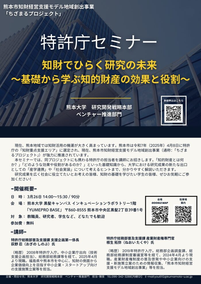 これを受け、現在推進されている「熊本市知財経営支援モデル地域創出事業(通称:ちざまるプロジェクト)」の一環として、特許庁の担当官をお招きしたセミナーを開催いたします。